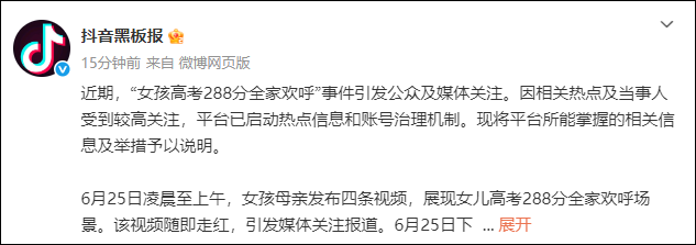近期,“女孩高考288分全家欢呼”事件引发公众及媒体关注。因相关热点及当事人受到较高关注,平台已启动热点信息和账号治理机制。现将平台所能掌握的相关信息及举措予以说明。