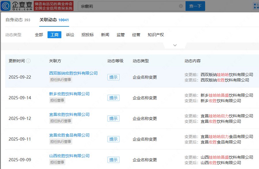 近期,已有多家娃哈哈关联公司更名为宏胜